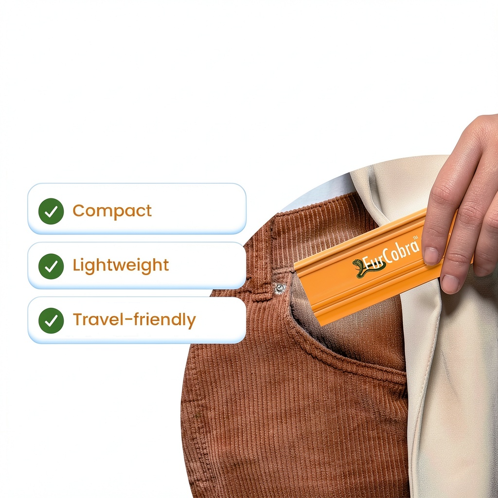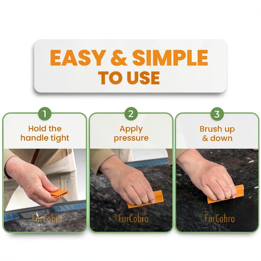 Ideal for home, car, and travel environments, the FurCobra is perfect for removing embedded pet hair from carpets, furniture, and vehicle interiors. Hold it at a 45-degree angle, press gently, and glide to lift fur efficiently. It suits pet owners, including those with dogs or cats, who need a portable tool for regular grooming and cleaning sessions, reducing allergens and maintaining a tidy space.